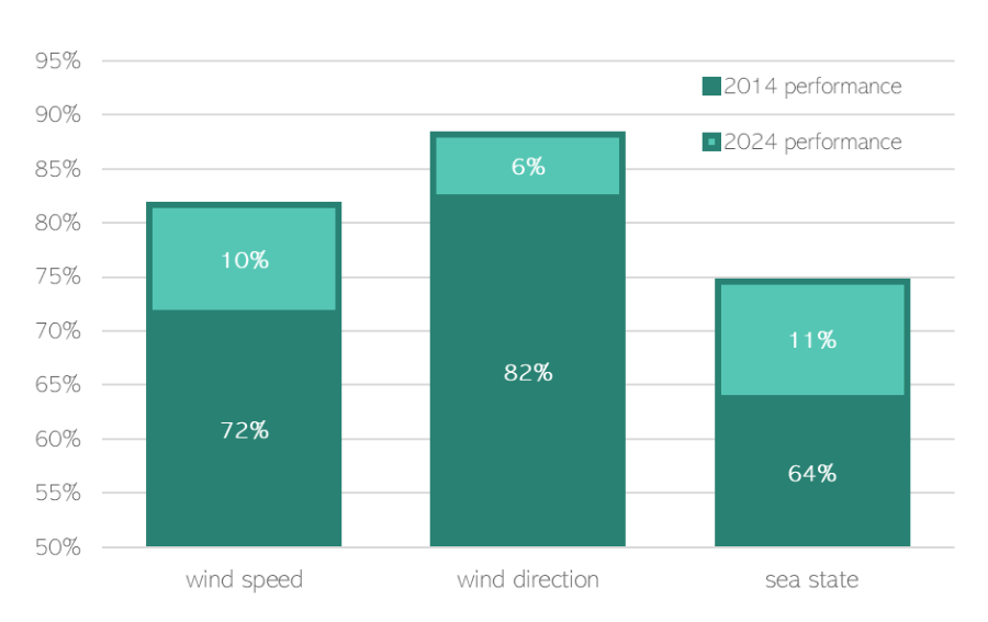 The Met Office analysis of Shipping Forecast data shows that wind direction maintains the highest accuracy, with wind speed and sea state also improving. Wind speed forecasts increased from 72 to 82 per cent accuracy, wind direction from 82 to 88 per cent, and sea state from 64 to 75 per cent.