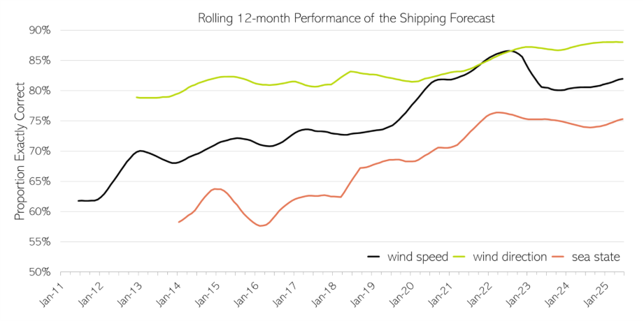 Shipping Forecast accuracy has increased since its inception, following historical events such as the 1859 storm that prompted national warning systems. Forecasts now include the Inshore Waters Forecast to support smaller vessels.